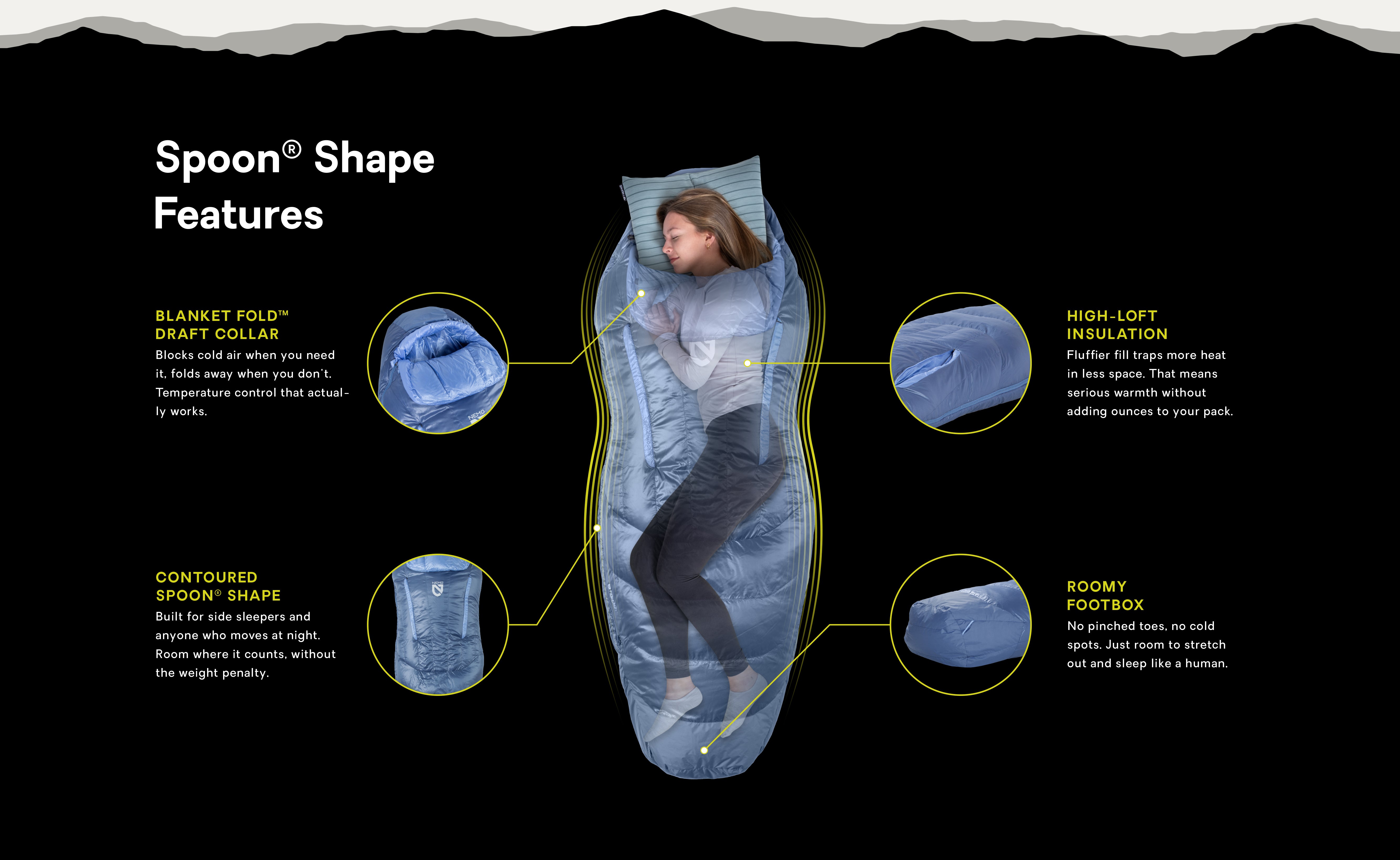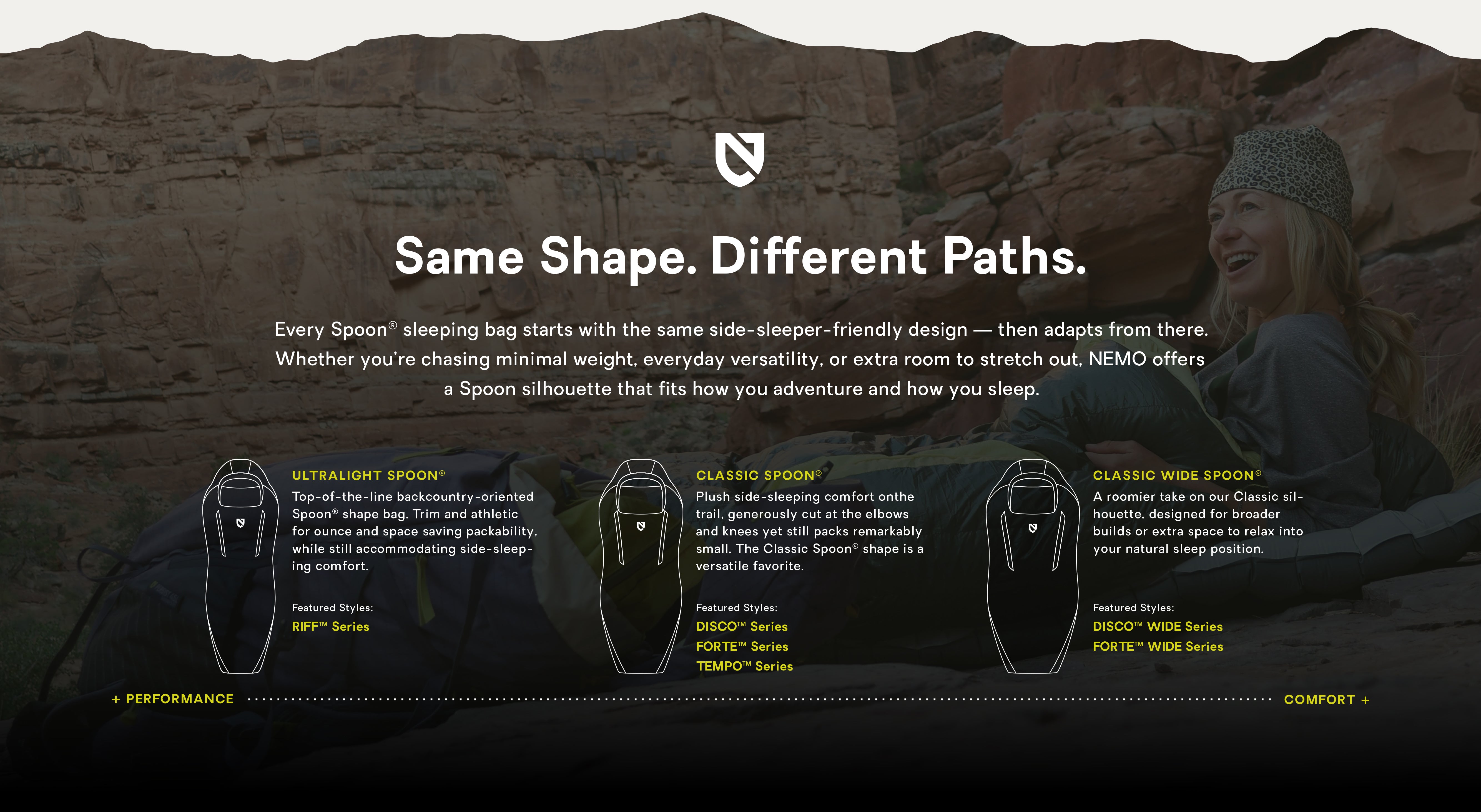 The first NEMO Spoon® bag launched in 2013, and we've continued to refine the shape ever since — adding ultralight versions and roomier options to provide more comfort and better sleep for all adventurers.
