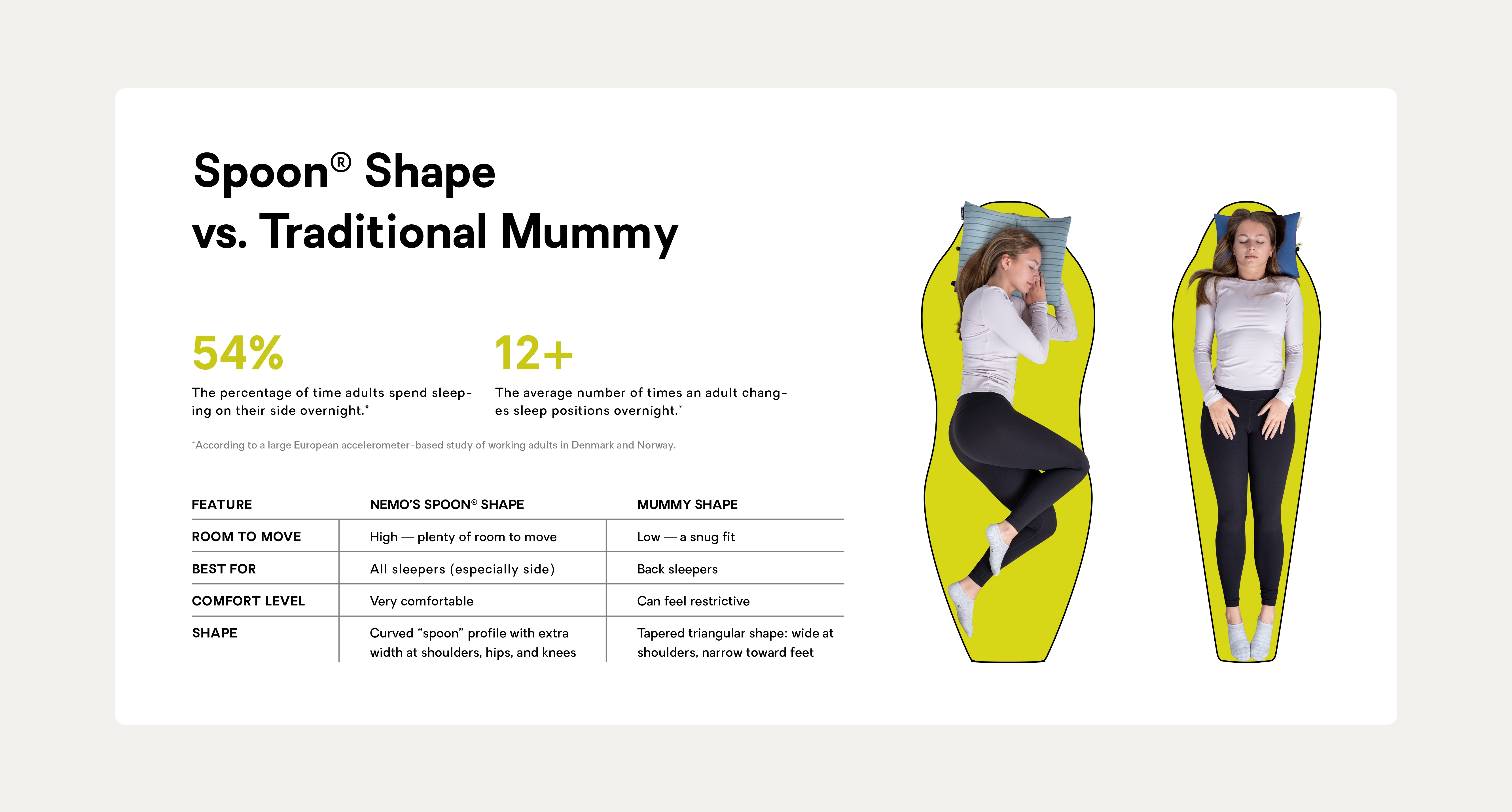 But for most people, it doesn't. Traditional mummy bags force your body into a fixed position, ignoring the way you naturally curl, shift, and settle. NEMO's Spoon® shape flips that approach. With strategically placed room at the elbows, knees, and hips — and nowhere else — Spoon bags let you move the way you actually sleep.